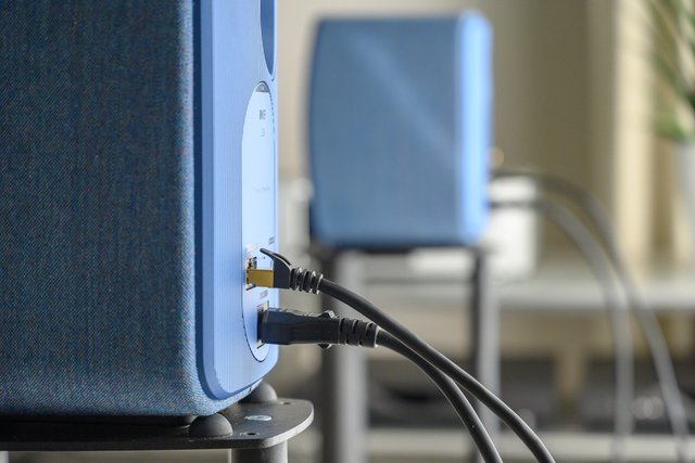 左右のスピーカーをLANケーブルを用いて有線で接続することもできる。また、左右のスピーカーの入れ替えもアプリから設定可能