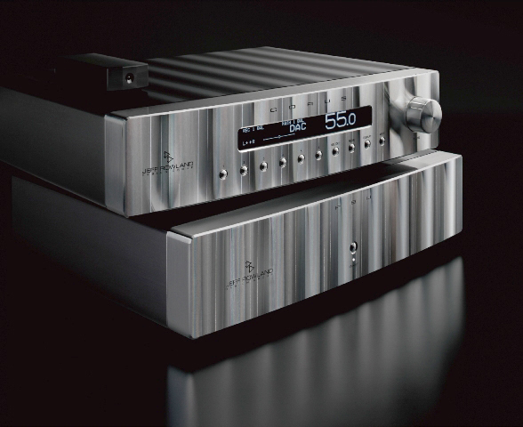 ジェフ・ロゥランドのプリアンプ「Corus/PSU」(3,330,000円、税別)。精密切削加工で削り出したアルミ・ヘアラインのシャーシの美しさも、本機の魅了されるポイント。サイズは、本体(上)が394W×94H×311Dmm(ノブ含む)で、電源部(下)が394W×98H×279Dmm。質量は、本体が10kgで、電源部が15.9kg