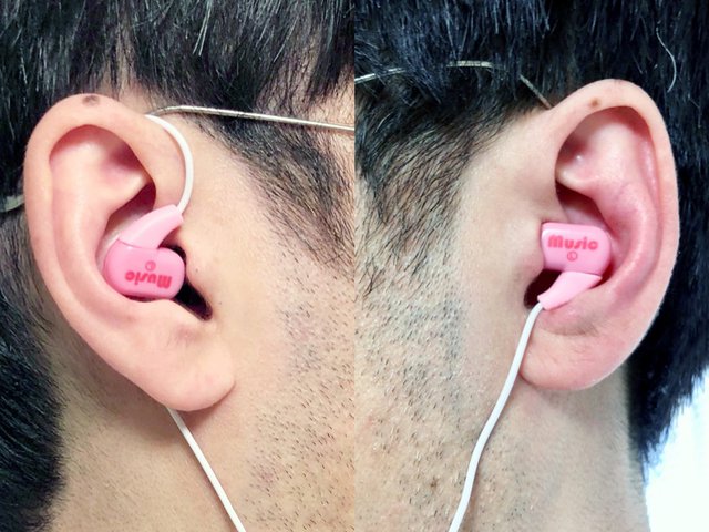 写真左が「左イヤホンを間違えて右耳に装着した様子」で、右が「左イヤホンを正しく左耳に装着した様子」