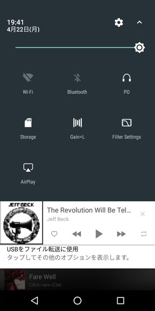 画面上部をスワイプして現れるメニューからは、ヘッドホン/ライン/同軸デジタル出力の切り替えやゲイン切り替え設定などが可能
