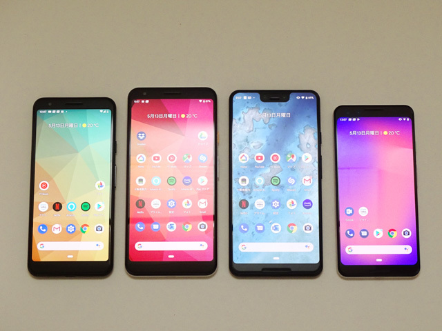 本体のサイズを比較。左からPixel 3a/3a XL/3 XL/3。フルディスプレイ仕様のPixel 3シリーズの方がわずかに画面が大きいのに本体サイズが小さめなのが特徴