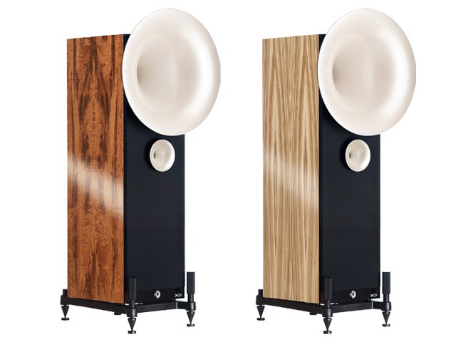 エンクロージャーの色は艶消しブラックと艶消しホワイトが用意され、特別仕様として突板のゼブラーノ(右)とタイガーローズウッド(左)を選ぶことが可能である(各+¥150,000・ペア/税抜)。また、ホーンカラーは10色が用意されている