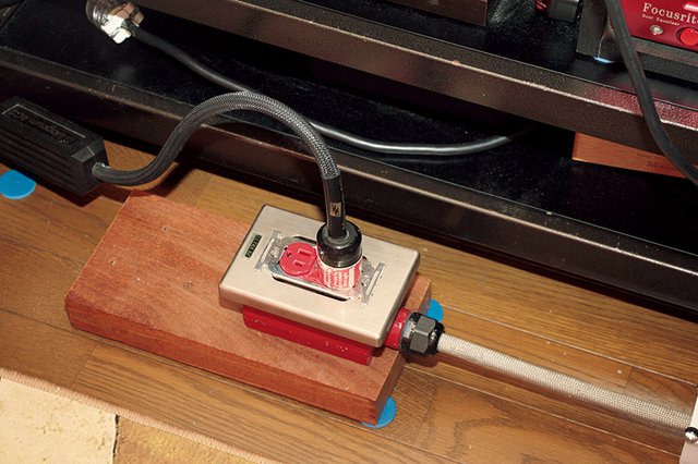 (1)鈴木氏は上のように電源コンセントを組み立てて使っている。硬く重い木の板にパナソニック電工の鋳鉄製スイッチボックスをネジ留めし、リプラスのコンセントベースSCB-2SZに壁コンセントRWC-2RUを取りつけたもの