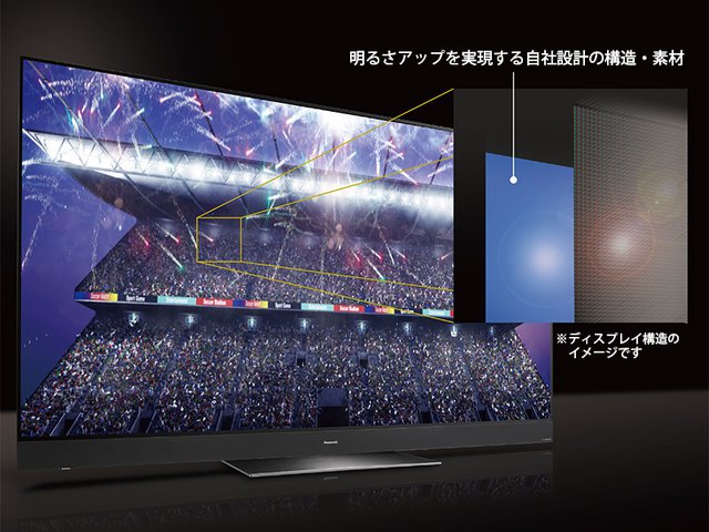 これまでにない明るさとコントラストを実現する、パナソニック独自の有機ELディスプレイ構造が最大の特長。輝度を高めるためにオリジナルの電源駆動回路や独自の構造・素材を採用したほか、光と色を分離した制御をおこなうことで、色抜けの少ない美しい映像表現を可能としている