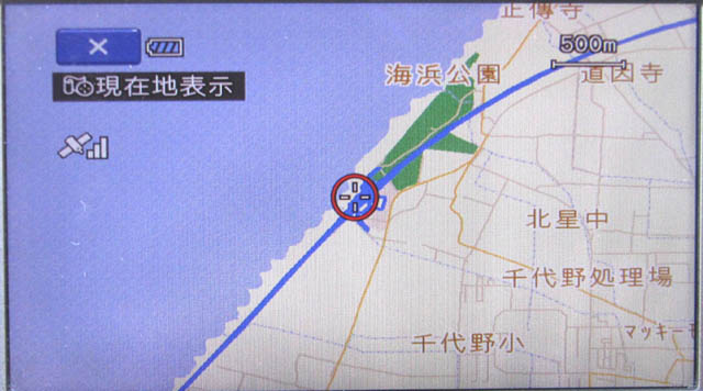 内蔵している地図データを使って、現在地をモニター上に表示してみた。場所は石川県金沢市郊外のサービスエリア。日本国内に限っては細街路までをサポートする