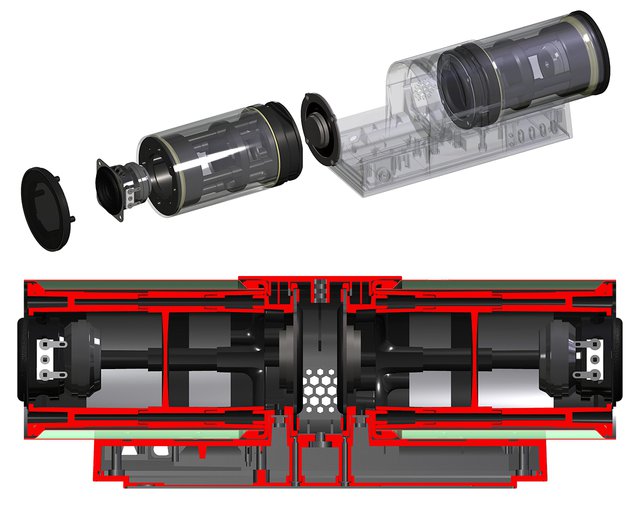 本体全体の透視図(上)と断面図(下)。左右外側に向けてスピーカーユニットを搭載している