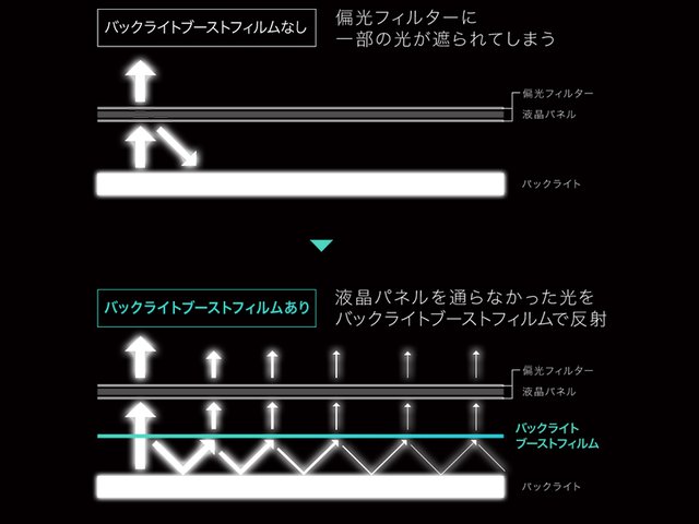 本来なら偏光フィルムに遮られて無駄になってしまうバックライトの光を反射させて無駄なく利用することで輝度を向上させる
