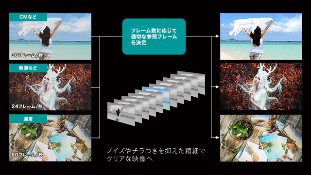 秒間30コマのCM映像、24コマの映画コンテンツ、60コマのテレビ番組といった具合に映像の種類を判別してそれぞれ適切なフレームを参照。その参照フレームに基づいて処理をすることでより正確に高画質化することができる