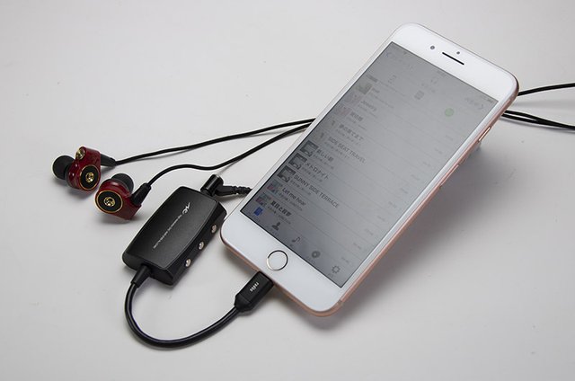 Lightning接続対応ヘッドホンアンプなど外部アンプを使えば、アップサンプリングしたサウンドを高品位のまま楽しめる(写真は「AL-LCH81K」と、ハイレゾ対応イヤホン