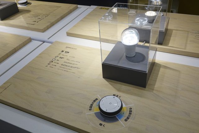 スマート照明「TRÅDFRI/トロードフリ」シリーズのコーナーには、さまざまなタイプのLED電球が展示されていました。回し込み型のE16、E17、差し込み型のGU10などのさまざまな口金のほか、1000lm、980lm、950lm、400lmと輝度も複数用意されています。また、色温度を変えられないタイプもあるため、選ぶ際には注意しましょう