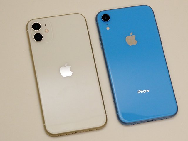 iPhone XRと並べて背面を比較してみると、アップルロゴの位置が変わり、iPhoneのテキストロゴがなくなっているのがわかる