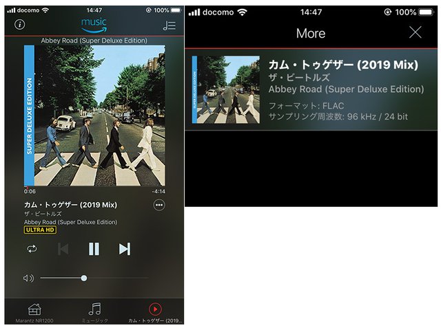 Amazon Music HDの再生画面。しっかりとロスレスのFLACで音源がストリーミングされていることを確認できる