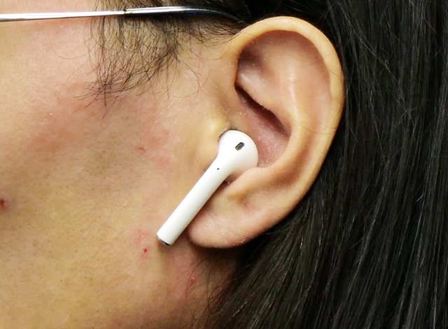 こちらはアップル「AirPods」(第2世代)を装着したところ。言われなければ気づかないかもしれない