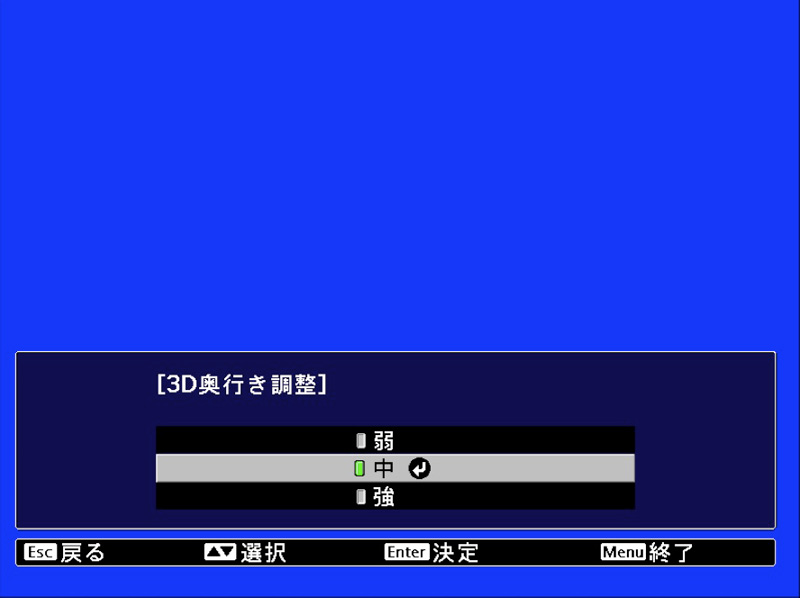 3Dの奥行き調整も強/中/弱から選択可能だ