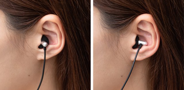 左が誤った装着方法。ボディが外を向いており、この状態だと低音が出ず、耳から外れやすい。右が正しい装着方法で、ボディ全体が耳にすっぽりと収まっており、“インエアー方式”の本領が発揮される