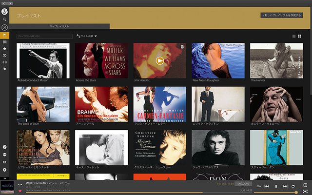 「マイプレイリスト」の一覧画面。アーティスト画像中央の再生アイコンを押すと1クリックで再生が始まり、そのまわりをクリックするとトラックリストが表示される。手持ちのサーバーの中身を見るような手軽さがあり、操作のレスポンスも速い。