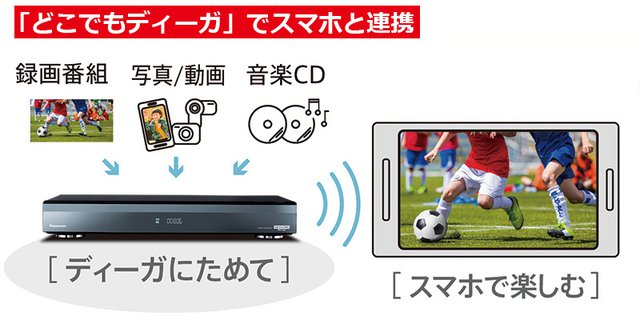 無料でダウンロードできるオリジナルのスマホアプリ「どこでもディーガ」を使えば、外出先からディーガに録画した番組を視聴したり、番組表から録画予約をしたりすることが可能になる。また、あらかじめディーガに自分で撮った写真や動画、音楽を保存しておけば、それらもインターネット経由でスマホやタブレットから楽しめる。スマホと連携してディーガをクラウドサーバーのように活用できる機能はとっても便利だ(※外出先からの録画番組視聴機能を使用するためには、ディーガ本体のソフトバージョンアップが必要な場合があります)