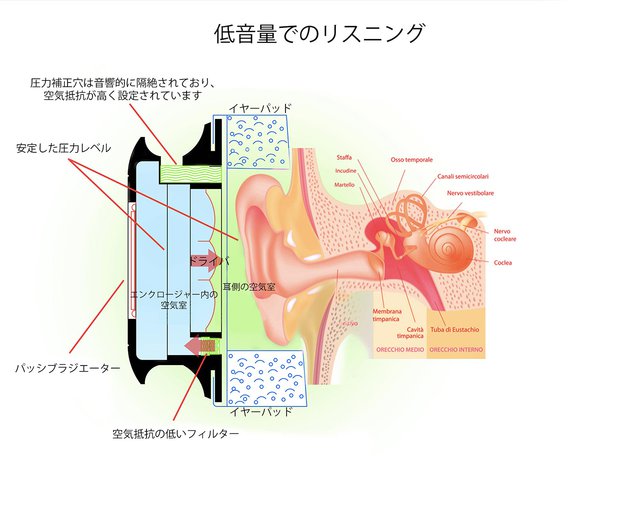 低音量時は左図のように、ヘッドホン内部のフィルターのみが駆動。そこから音量を上げていくと、右図のように外部フィルターが加圧を発散し、それを補うようにパッシブラジエーターが駆動する