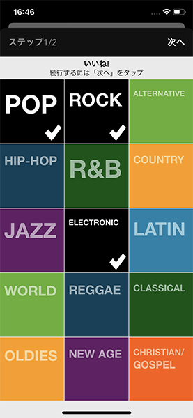 最初に使う際はお気に入りのジャンルやアーティストを選択する(スキップも可能)