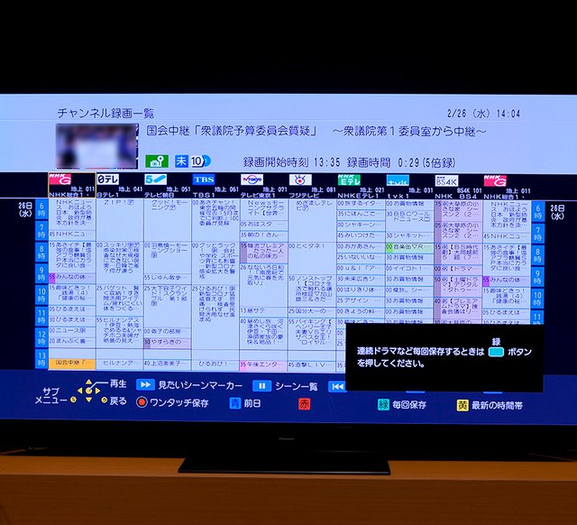 チャンネル録画一覧の画面。通常のEPGと同じ感覚で録画済み番組を探すことができる