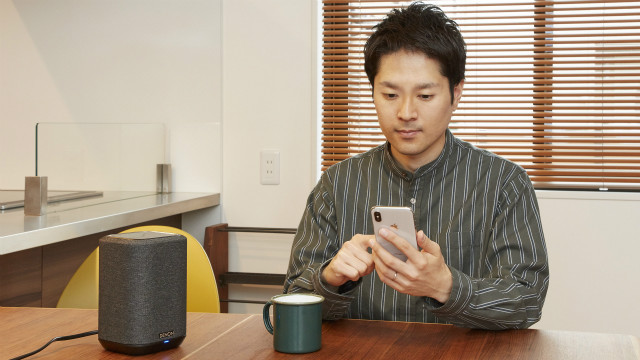 音を確認中のKさん。普段はApple Musicも使用して音楽を楽しんでいる。DENON HOME 150はそんなAppleユーザーも安心な「AirPlay 2」にも対応するので、対応AVアンプがあればHEOSと同様のマルチルーム再生ができる