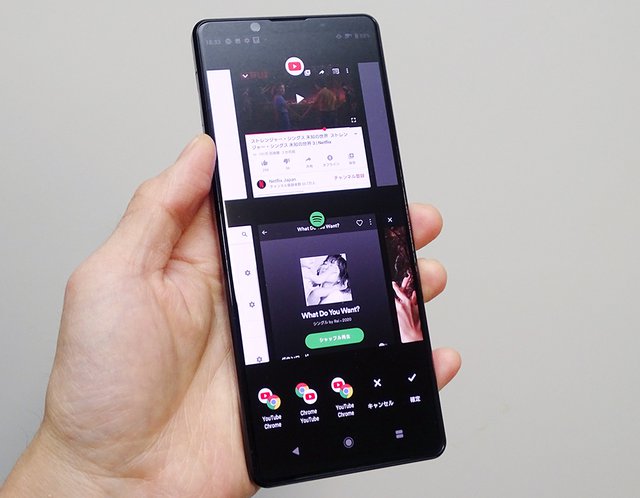 ワイドな画面を上下に分割して2つのアプリを同時に動かせる「21対9 マルチウィンドウ」機能。アップデートにより上下のアプリを左右スワイプで素速く切り換えられるようになった