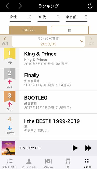 アプリで再生されている楽曲ランキング。同世代の友人の聴いている楽曲の体感に近くて驚き
