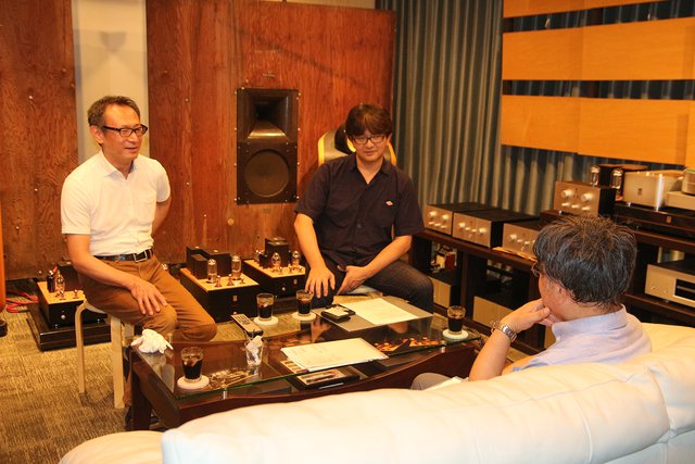 オーディオ・ノートの試聴室。代表取締役社長の芦沢雅基氏(左)と廣川嘉行氏(右)