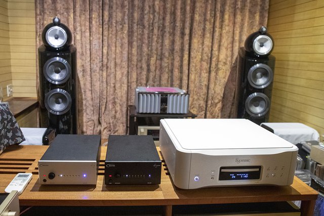 エソテリックのK-03XDと組み合わせ。左がREF10、中央がREF10 SE120。フロントパネルはいずれもアルミニウムとブラックを用意している