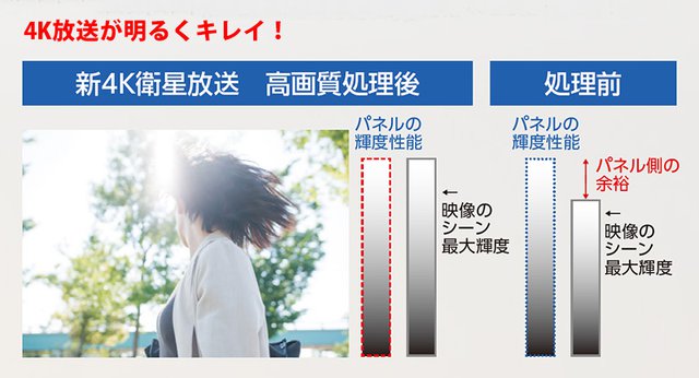 AIを活用したシーン解析型HDR高画質化処理でSDRも高コントラストな映像に。さらに新たなアルゴリズムの採用でパネルのコントラスト性能を最大限引き出し4K衛星放送に採用されているHLGの画質も大幅に向上させた