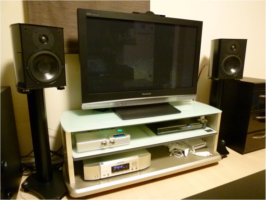 我が家のシステムです。本当はスピーカーをもっとちゃんと設置したいのですが、子供が小さいため、転倒防止のため挟み込むにしています