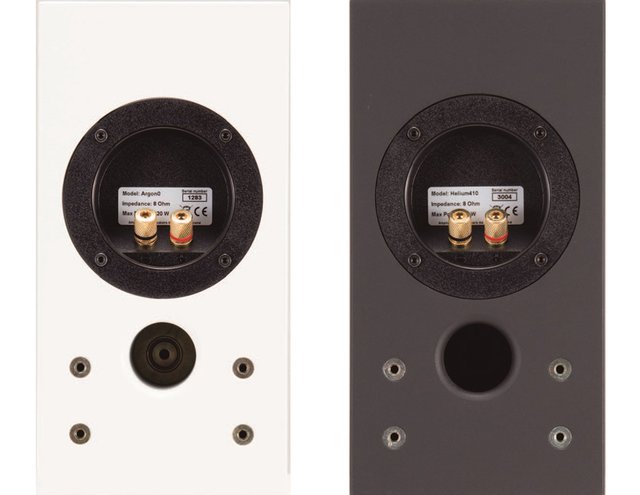 「Helium410」(右)と「Argon0」(左)の背面部。両機ともシングルワイヤリング専用で、端子やバスレフポートの位置など、構成はほぼ同じである