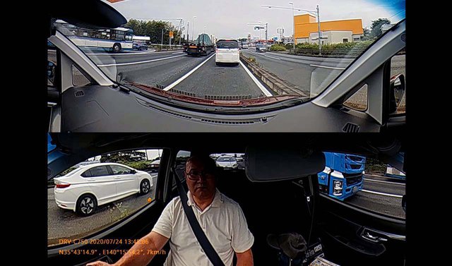 2分割モードでは前方向をパノラマで撮影し、車内と左右、さらに後方を僅かに捉える