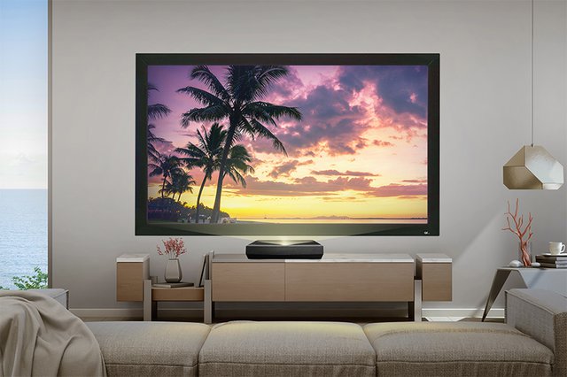 リビングに設置したイメージ。映画をみるだけでなく、テレビの代わりとしても大画面は使いやすく、今増えているオンライン飲み会や帰省などの交流も、よりリアルなものとして体験できる