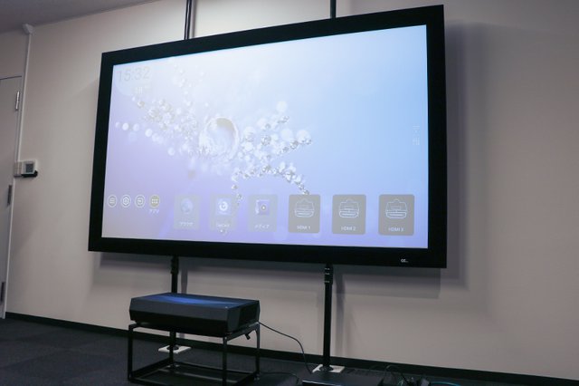 オプトマの販売代理店であるオーエスプラスeの視聴スペースにて、張り込み型のレイロドールを使用して投写した。画面サイズは100インチ