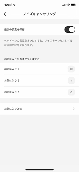 ノイズキャンセリングのプリセット値を3つまで「お気に入り」としてカスタマイズできる