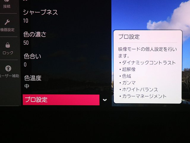 映像モードを選んでからさらに画質を調整することも可能。加えて、さらに細かな項目を調整できる「プロ設定」なども用意している