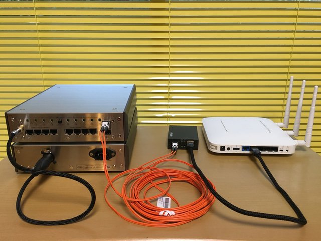 OP-S100とS10の接続例。S10のSFPポートとメディアコンバーター(中央の黒い筐体)を光ファイバーケーブル(オレンジ色のケーブル)で接続し、ルーターとメディアコンバーターをLANケーブルで接続する