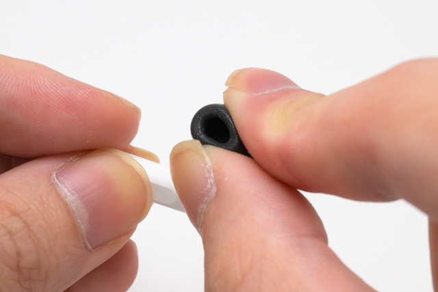 耳に入れる前に軽く押しつぶしてから入れるのがコンプライの作法。耳の中で膨らみながら体温で柔らかくなり、やがて耳にピッタリとフィットするのだ