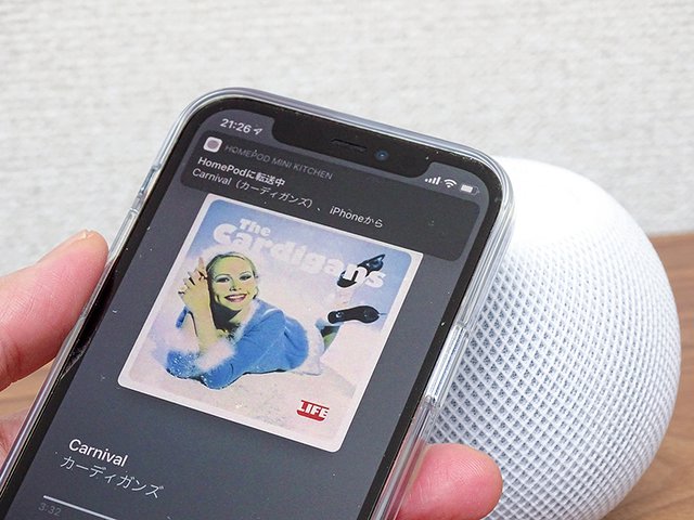 iPhoneで再生中の楽曲をHomePod miniに近づけると自動的に転送できるハンドオフ機能は、スピーカーを手元近くに置いて音楽を聴く時にとても便利。Apple Musicだけでなく、Amazon MusicやSpotifyで音楽を聴いている時にも機能する