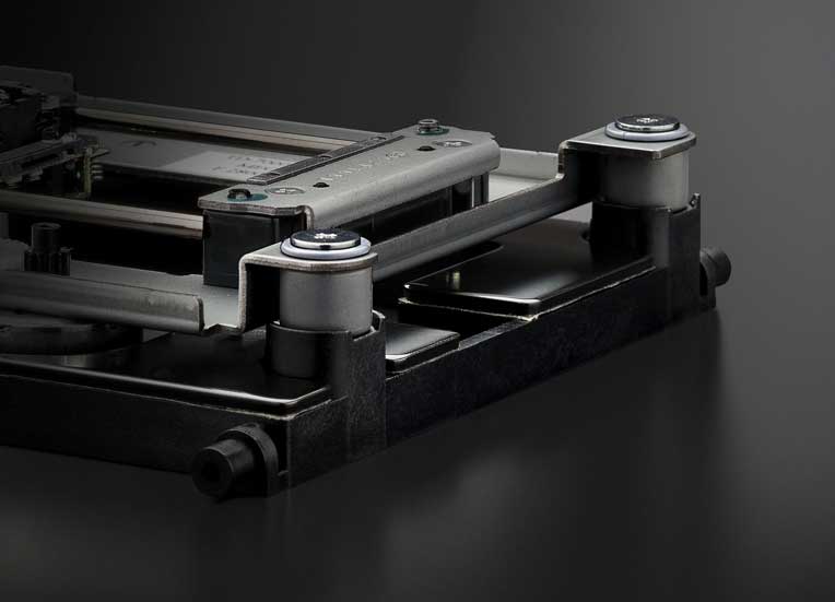 トラバース・メカを弾性ダンパーで支えることで外部振動の影響を大幅に低減させる