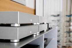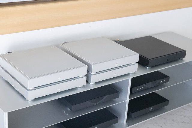 fidataの新旧モデル4モデル(シルバー)に加えて、黒はシャーシを強化し専用SSDユニットを搭載した「HFAS-XS20」。新旧比較に加え参考にXS20も試聴した