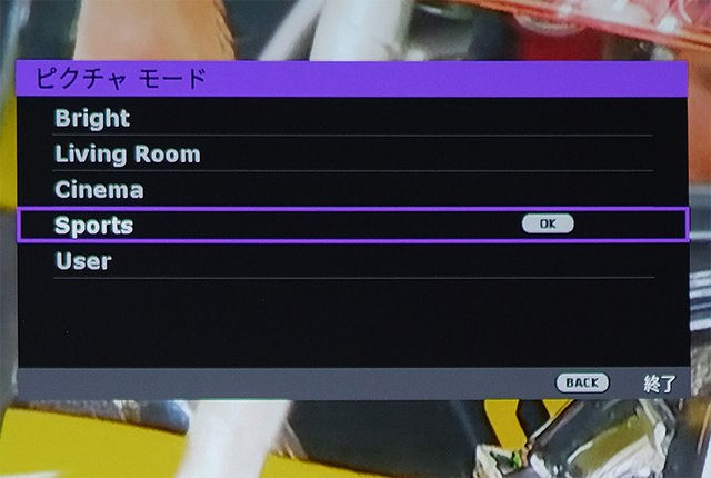 ピクチャモードに「Sports(スポーツ)」を備えるなど、高輝度かつ動きに強いのがTK850iの特色だ