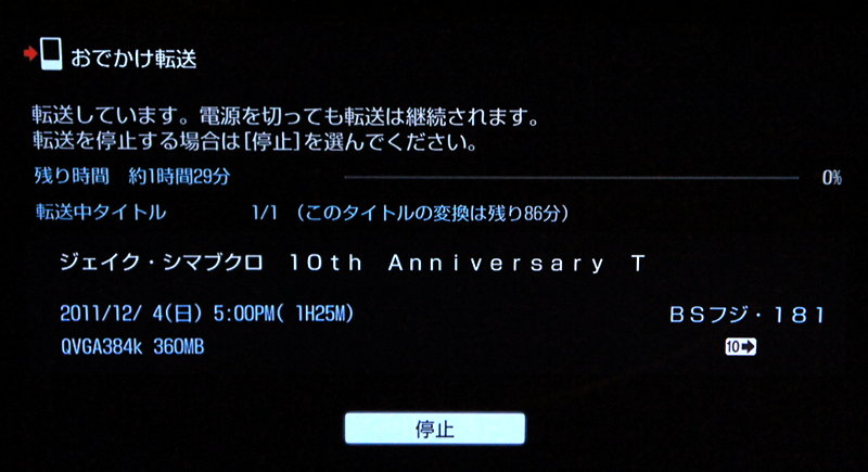 BDレコーダーで本機にお出かけ転送を行っているところ