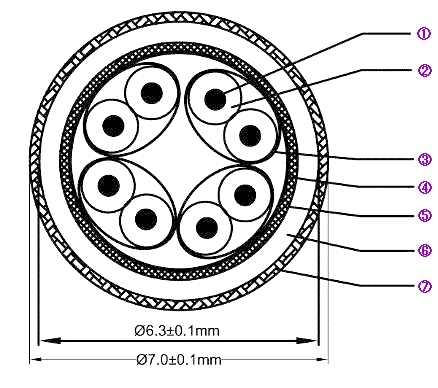 ケーブル構造図と素材。(1)導体:19/0.12 24AWG純銀メッキα(Alpha) OCC、(2)絶縁:特殊な高密度ポリエチレン4対のツイストペアケーブル、OD.1.35±0.05mm (B/W/10.8mm);(O/W/22mm);(G/W/10.8mm);(B/W/10.8mm)、(3)シールド1:10mm導電性アルミ箔シールド(静電気と電磁波防止)、(4)シールド2:16mm導電性アルミ箔両面シールド(静電気と電磁波防止)、(5)シールド3:16/10/0.10 TCα(Alpha) 導体編組シールド(EMI,FFI,RF防止)、(6)シース1:RoHS指令適合の特殊な柔軟性UL/CL3 PVC、(7)シース2:ナイロンスリーブ (高性能な制振効果を発揮)