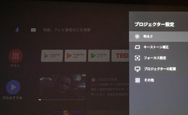 プロジェクター設定から、キーストーン補正(台形歪み補正)や、明るさなどを細かく設定できる