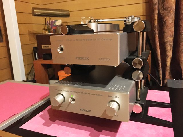 FIDELIXのフォノイコライザー「LEGGIERO」(下段)とMCヘッドアンプ「LIRICO」(上段)。フルテックのNCF Boosterで重ねている