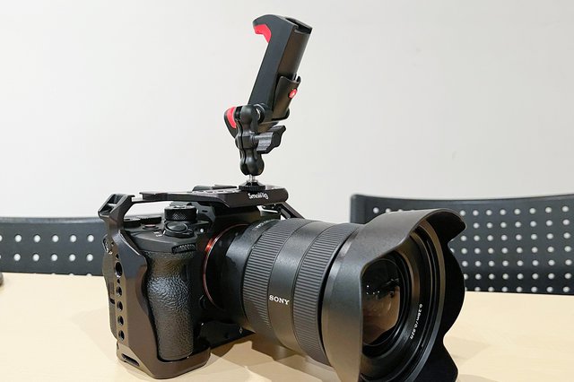 α7S IIIにケージを装着し、アームとクランプを使ってXperia PROを固定する