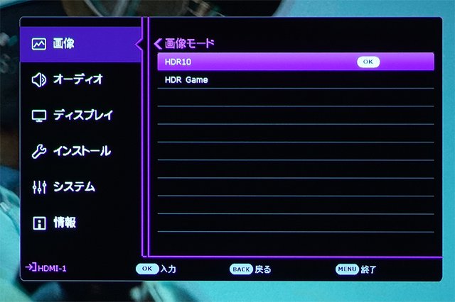 HDR信号が入力された場合、映像モードは「HDR10」「HDR Game」から選択可能