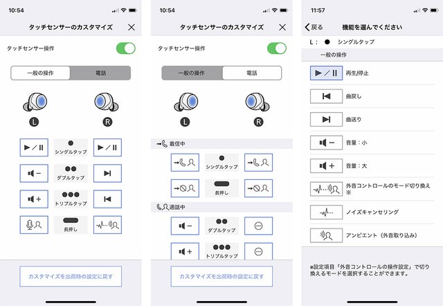 タッチセンサーの設定は、一般的な基本操作系と電話利用時の操作系をそれぞれ細かに設定可能